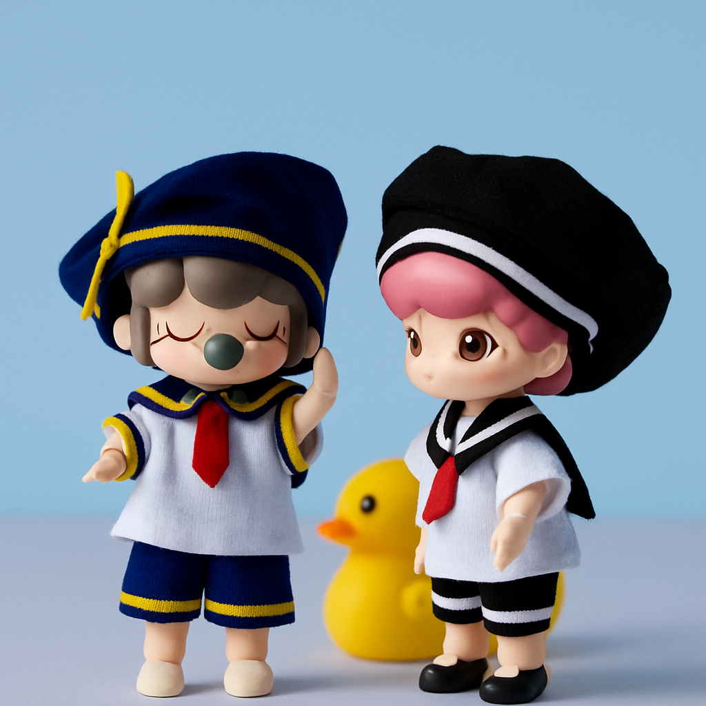 愛らしいぬいぐるみ服の本格コーデセットです。 帽子、上着、ショートパンツの3点構成で、セーラー襟と金色ラインがアクセントの華やかなデザイン。 赤いネクタイ付きで学生風の雰囲気を演出し、ゴールド級の仕上がりでお人形の着せ替えを存分にお楽しみいただけます。
