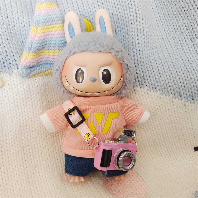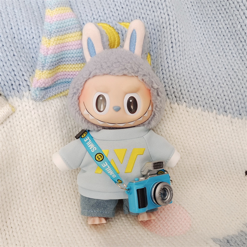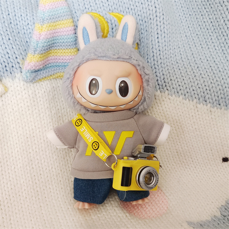 笑顔マークがついた斜め掛けストラップとミニカメラの小物がセットになっており、写真撮影が好きなキャラクターを演出できます。