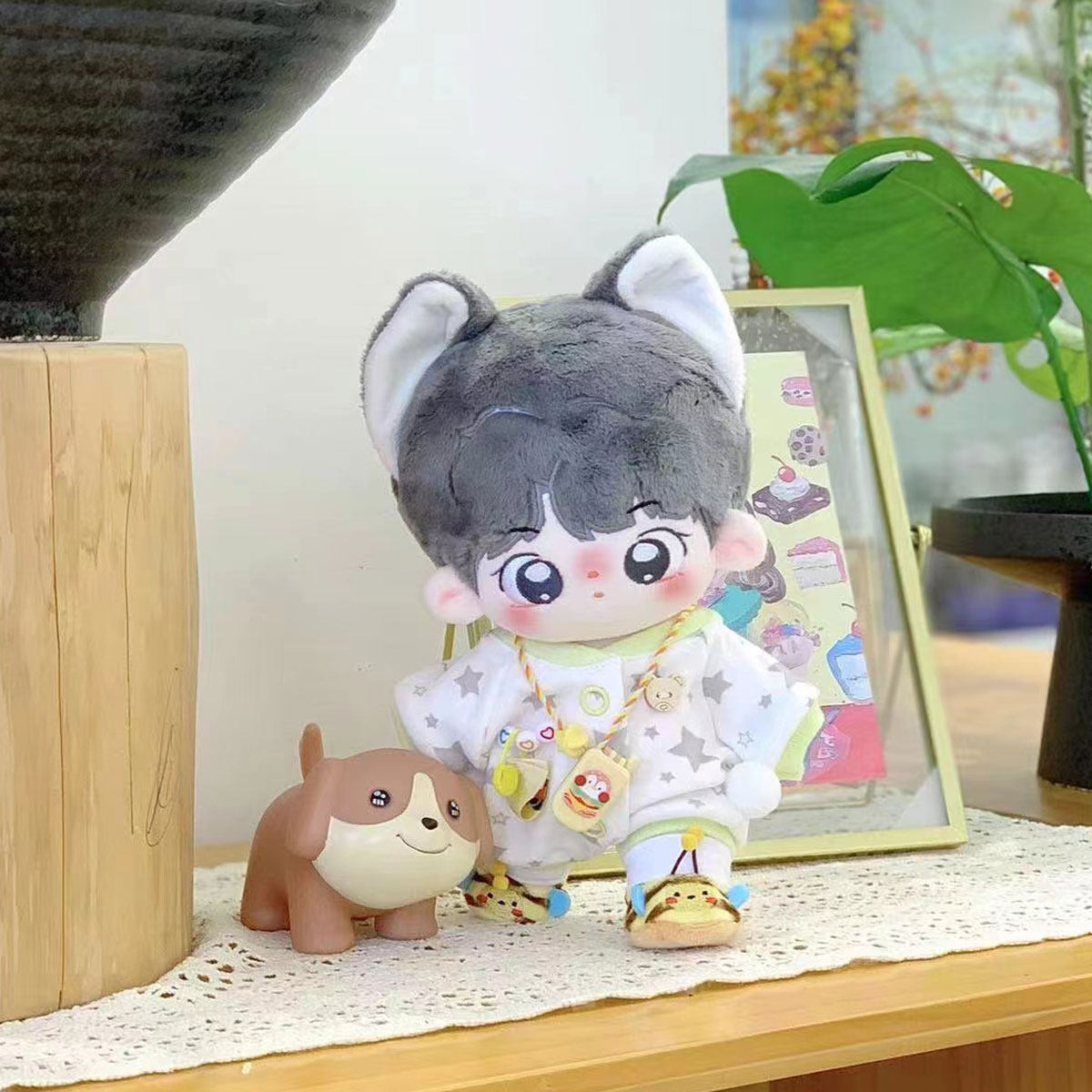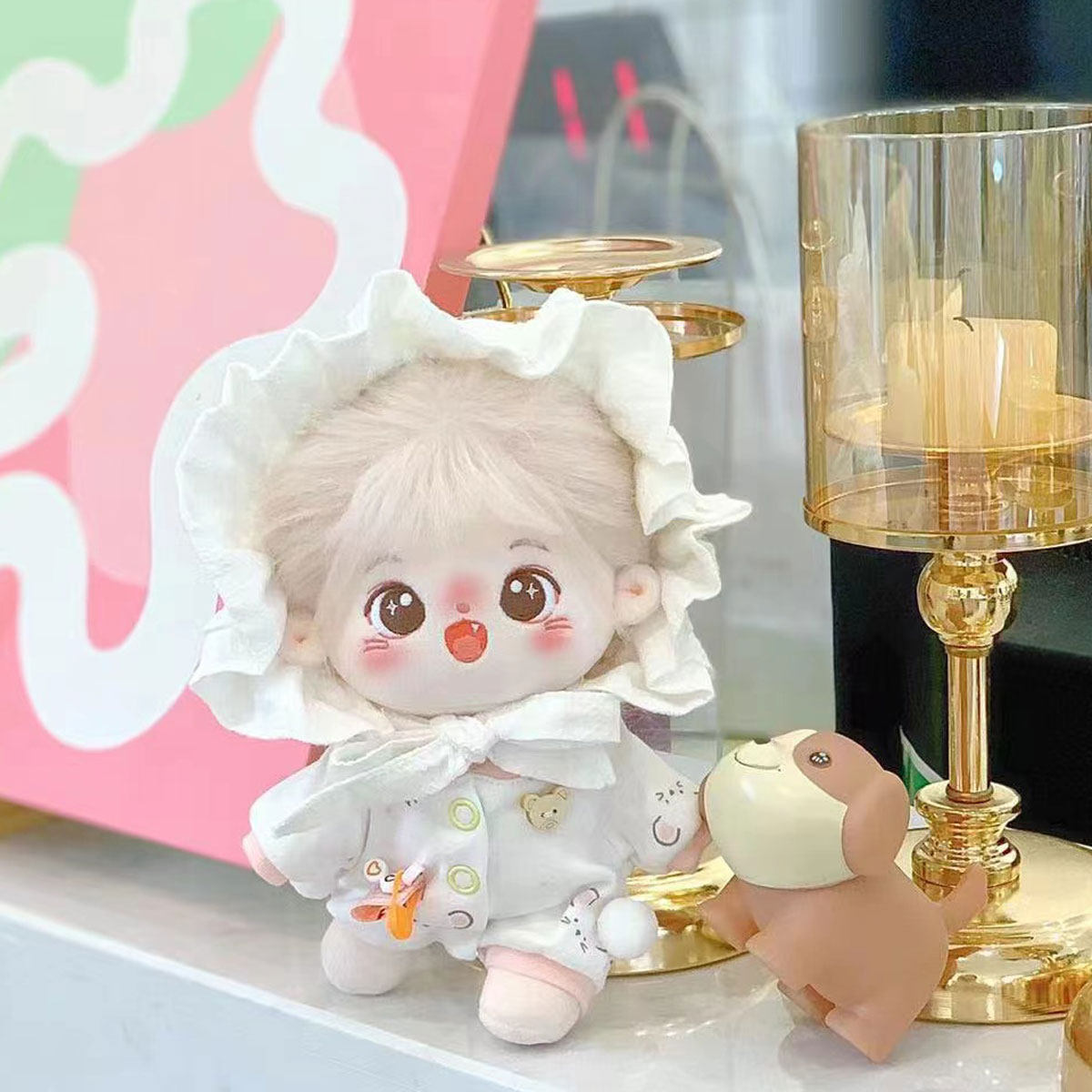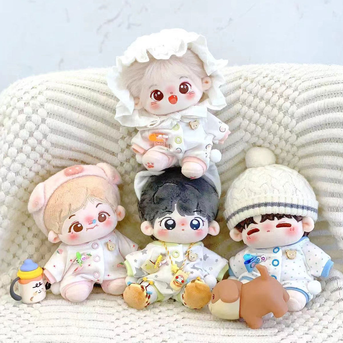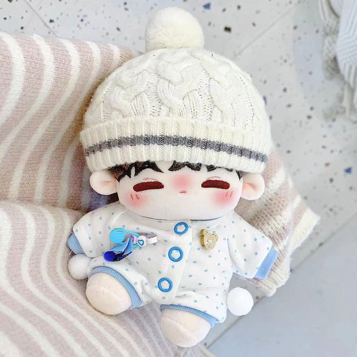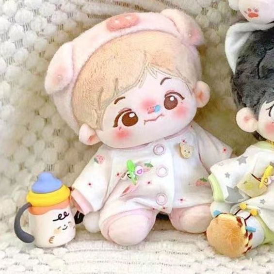 20cmサイズのぬいぐるみにぴったりな愛らしい衣装セットです。 頭には帽子を被り、かわいらしい雰囲気を演出します。 衣装はパジャマ風デザインで、様々な刺繍がアクセントになっています。 20cmのぬいぐるみ服として着脱も簡単で、大切なぬいぐるみをさらに可愛く変身させることができます。 おやすみタイムやリラックスシーンにぴったりの癒し系コーディネートです。